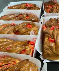 Après le succès de nos babkas chocolat et nature, nous avions lancé l’idée de proposer tous les mois une nouvelle recette : en janvier 2021, la babka des rois à la crème d’amande et en février praline rose : le contraste de texture de la babka est encore plus gourmand avec le croquant et le parfum des pralines rose. Bref, elle a tellement plu qu’elle est rentrée dans les permanentes. Tiédissez-la au four quelques minutes avant dégustation.
