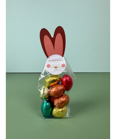 Sachet d'œufs en chocolat au lait praliné, noir gianduja, lait gianduja aux éclats de biscuits, lait gianduja aux éclats de crêpe croustillante et lait ganache caramel.