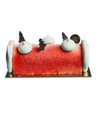 Création de Noël 2024 pour les fans de bûches : la gourmandise d'une bûche classique et la légèreté des parfums emblématiques de La Meringaie : citron vert, framboise et fruit de la passion. Des tourbillons de meringues en décoration.