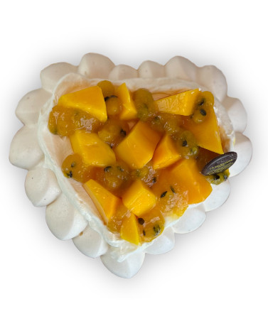 Coeur de meringue, crème fouettée à l'orange, orange, fruit de la passion et mangue