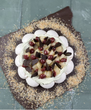 Meringue, crème fouettée à la pistache, griottes, poires pochées et de fine plaques de chocolat croustillantes façon chocolat de Dubai
