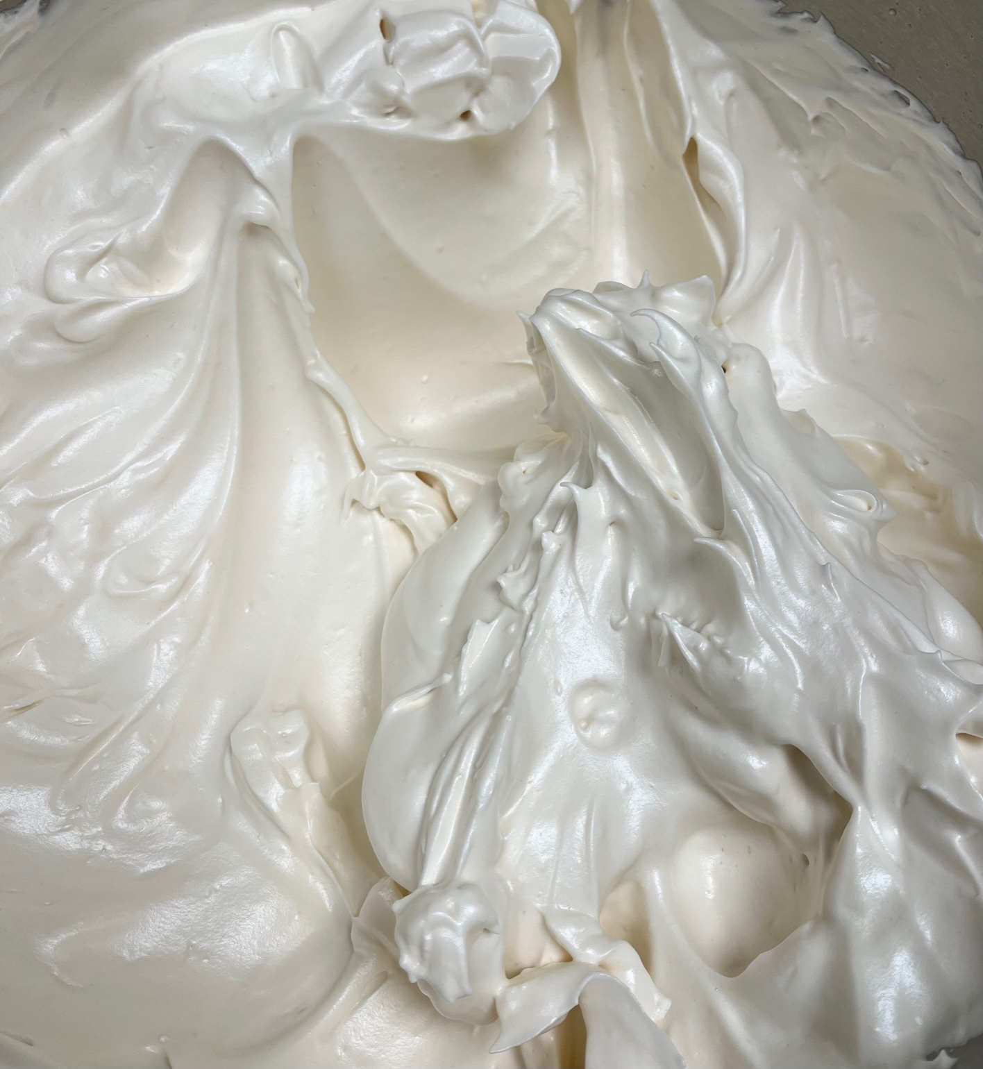 Pesez tous les ingrédients dans des petits récipients. Soyez précis : l’équilibre de la meringue est strict. Versez le blanc d’œuf dans le cul de poule de votre robot KitchenAid qui vous servira à monter la meringue. Ajoutez le sucre et la Maïzena®. Mélangez au fouet. Fouettez au batteur à vitesse 6-8 pendant 10 minutes. Au bout des 10 minutes, ajoutez la cuillerée à café de vinaigre. Fouettez de nouveau 1 minute à vitesse maximale pour « serrer » les blancs. Le cas échéant, ajoutez les épices. Fouettez quelques secondes pour obtenir un mélange homogène. La meringue possède la bonne texture pour être pochée quand elle forme un « bec d’oiseau » très ferme.